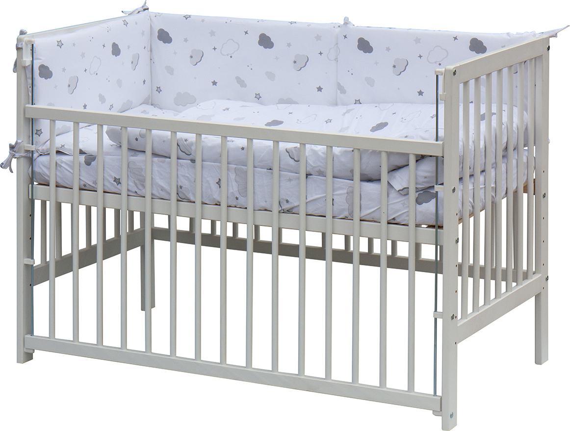 1. Dětská dřevěná postýlka 120 x 60 cm - bílá, masiv borovice, stahovací bok, 6 poloh roštu