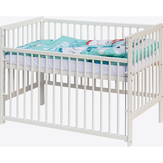 1. Dětská dřevěná postýlka 120 x 60 cm - bílá, masiv borovice, stahovací bok, 6 poloh roštu