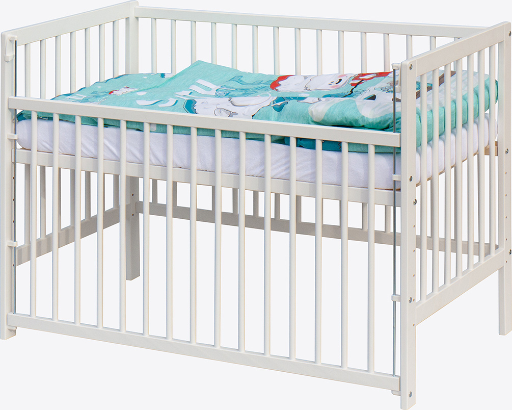 1. Dětská dřevěná postýlka 120 x 60 cm - bílá, masiv borovice, stahovací bok, 6 poloh roštu