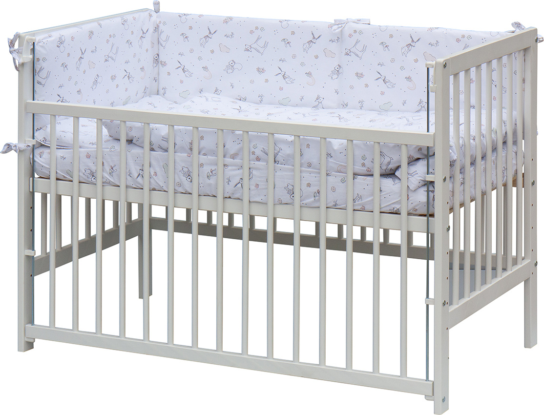 1. Dětská dřevěná postýlka 120 x 60 cm - bílá, masiv borovice, stahovací bok, 6 poloh roštu