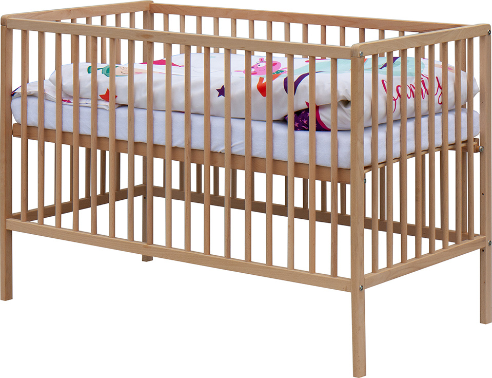 1. Dětská dřevěná postýlka 120 x 60 cm - přírodní, masiv borovice, 3 vyndavací příčky, 3 polohy roštu,