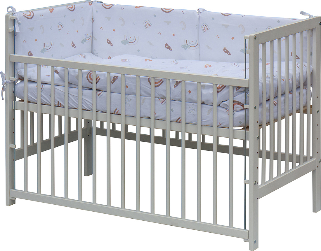 1. Dětská dřevěná postýlka 120 x 60 cm - bílá, masiv borovice, stahovací bok, 6 poloh roštu