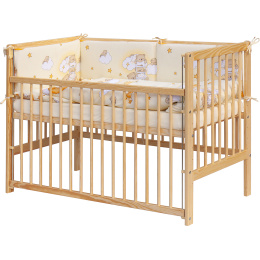1. Dětská dřevěná postýlka 120 x 60 cm - přírodní, masiv borovice, stahovací bok, 6 poloh roštu