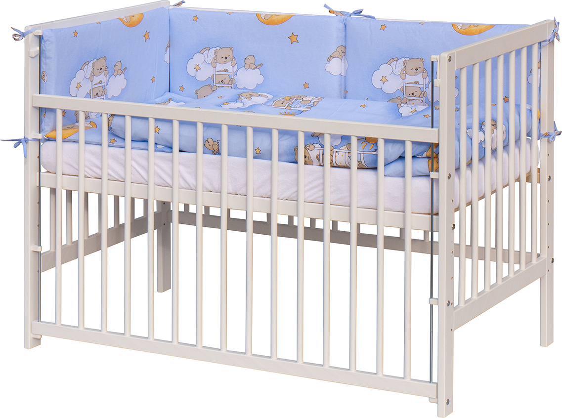 1. Dětská dřevěná postýlka 120 x 60 cm - bílá, masiv borovice, stahovací bok, 6 poloh roštu