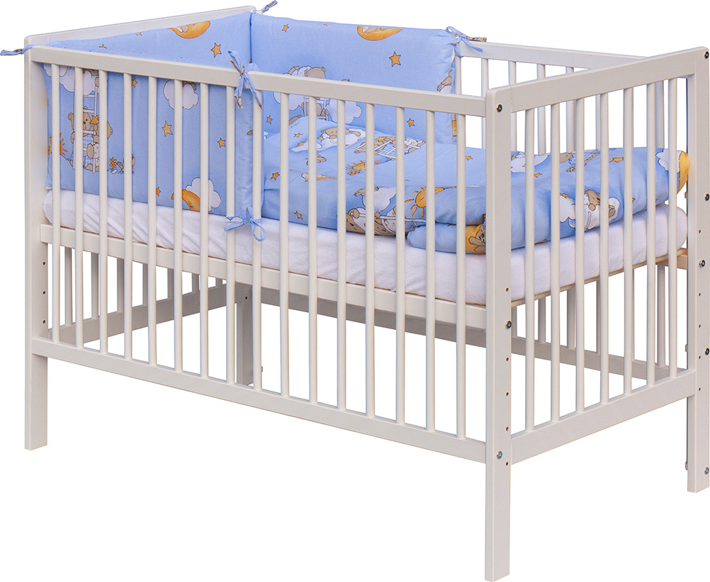 1. Dětská dřevěná postýlka 120x60 cm - bílá, masiv borovice, 3 vyndavací příčky, 5 poloh roštu, nohy jsou předvrtané pro možné nasazení koleček