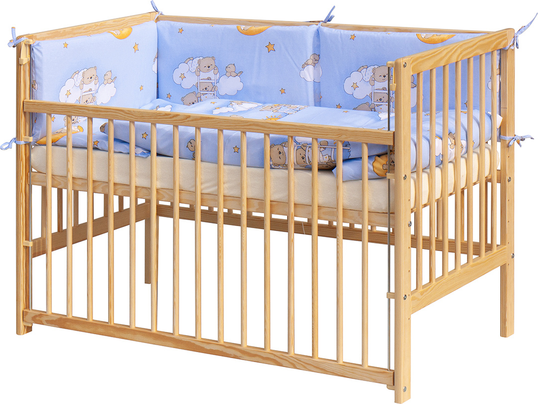 1. Dětská dřevěná postýlka 120 x 60 cm - přírodní, masiv borovice, stahovací bok, 6 poloh roštu