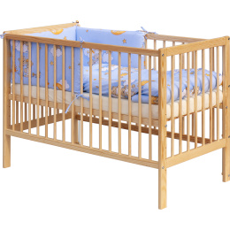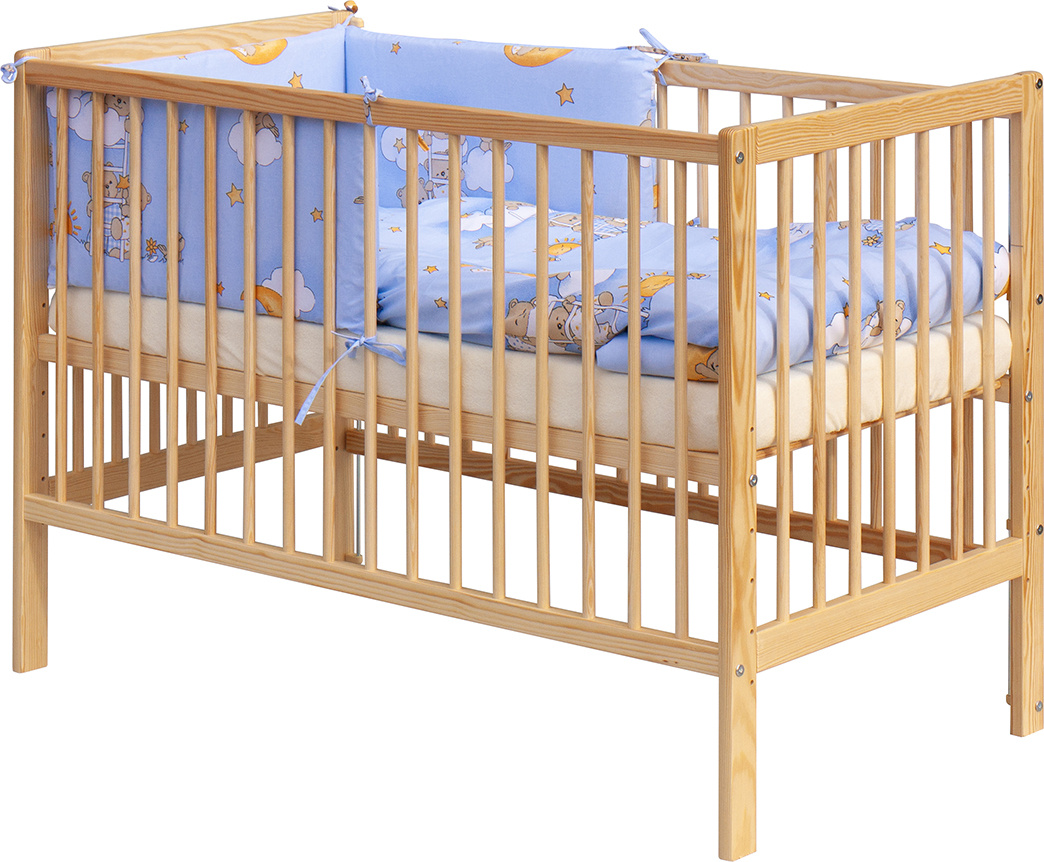 1. Dětská dřevěná postýlka 120 x 60 cm - přírodní, masiv borovice, 3 vyndavací příčky, 6 polohy roštu, nohy postýlky jsou předvrtány pro případné nasazení koleček