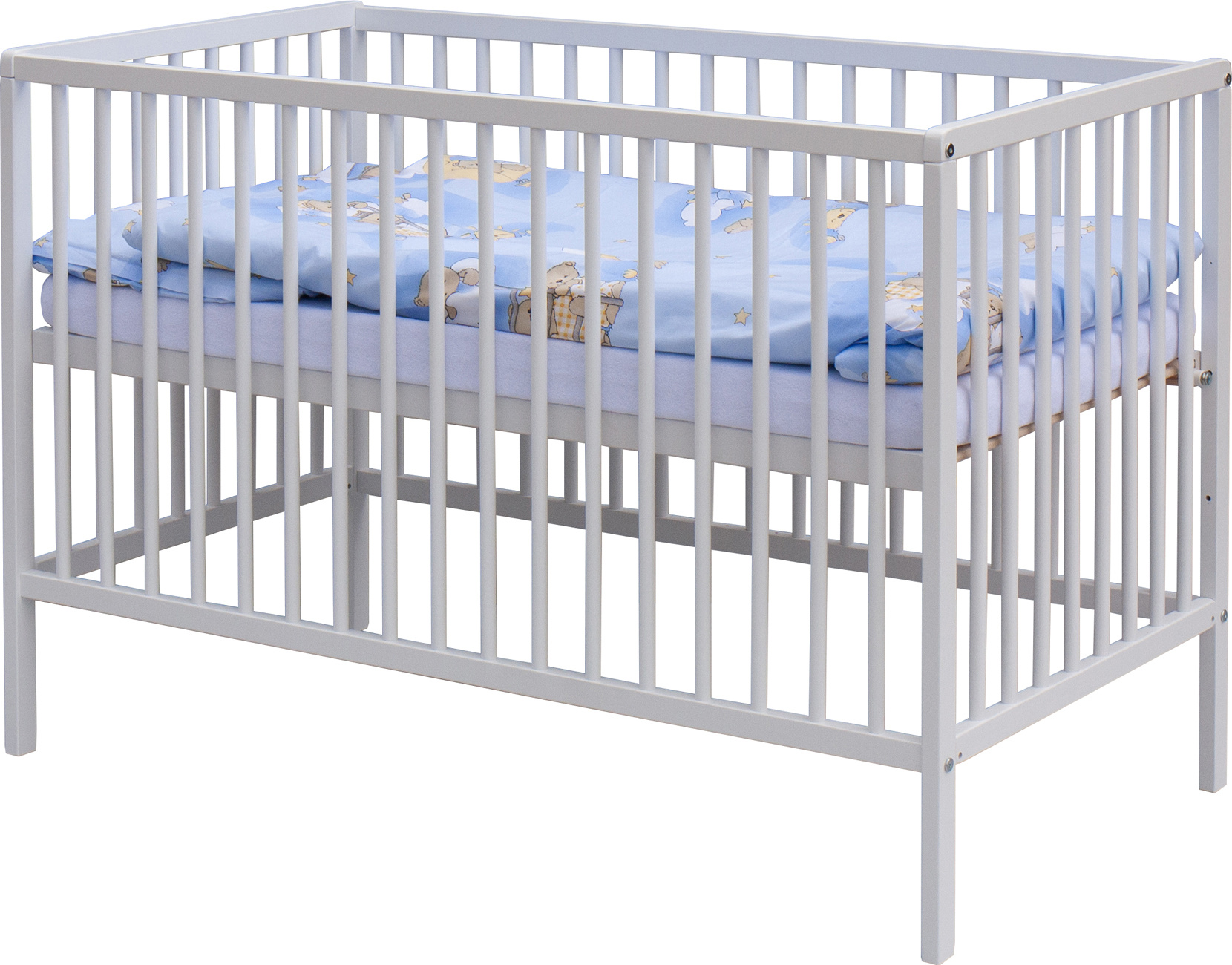 1. Dětská dřevěná postýlka 120 x 60 cm - bílá, masiv buk, 3 vyndavací příčky, 2 polohy roštu