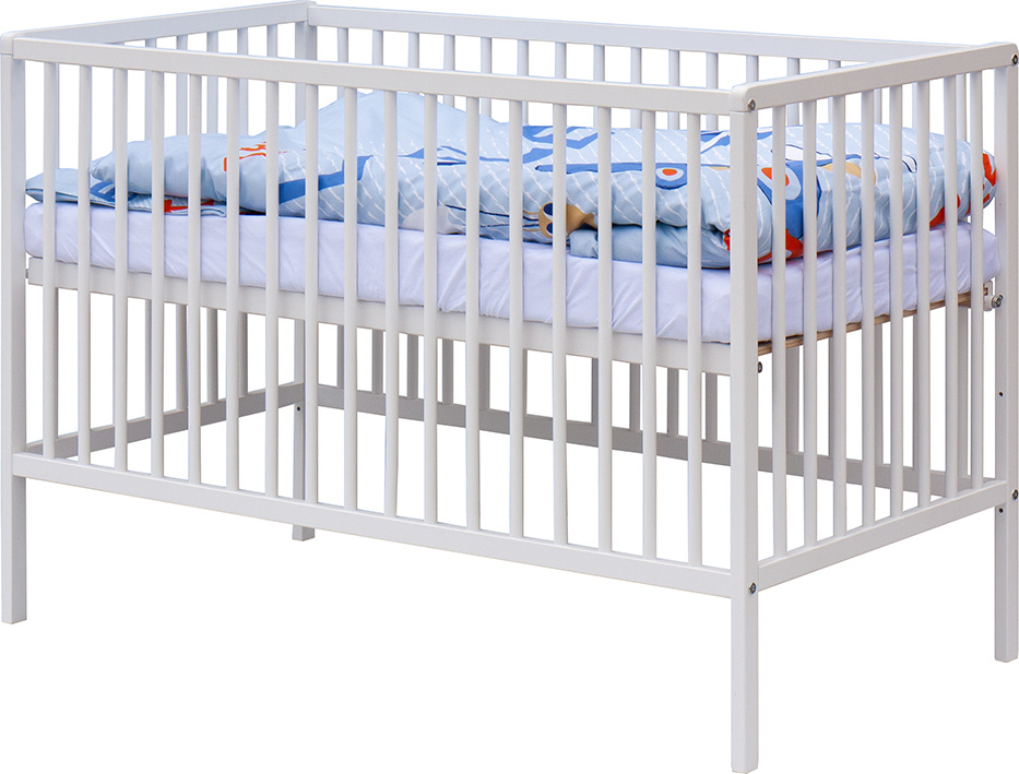 1. Dětská dřevěná postýlka 120x60 cm - bílá, masiv buk, 3 vyndavací příčky, 3 polohy roštu