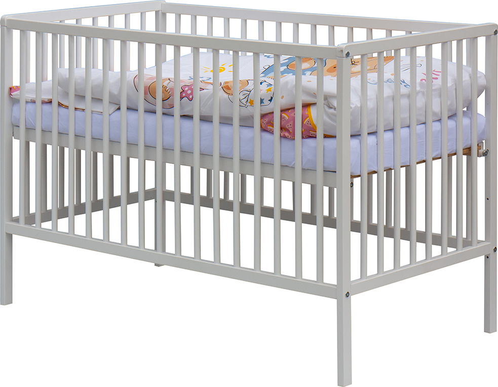 1. Dětská dřevěná postýlka 120x60 cm - bílá, masiv buk, 3 vyndavací příčky, 3 polohy roštu