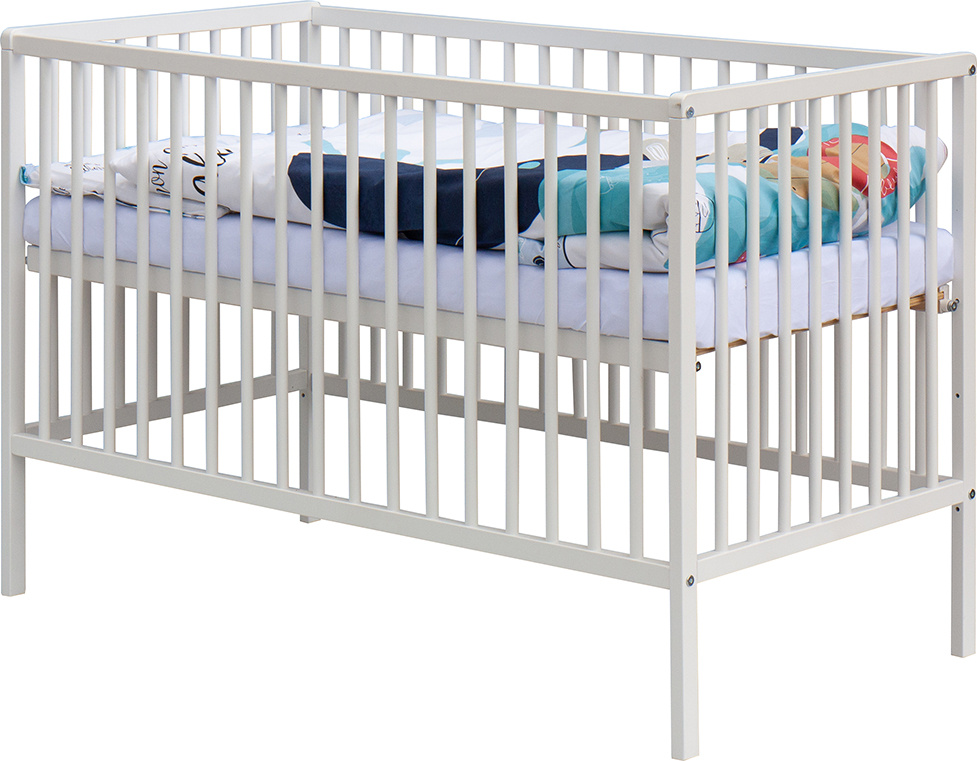 1. Dětská dřevěná postýlka 120x60 cm - bílá, masiv buk, 3 vyndavací příčky, 3 polohy roštu