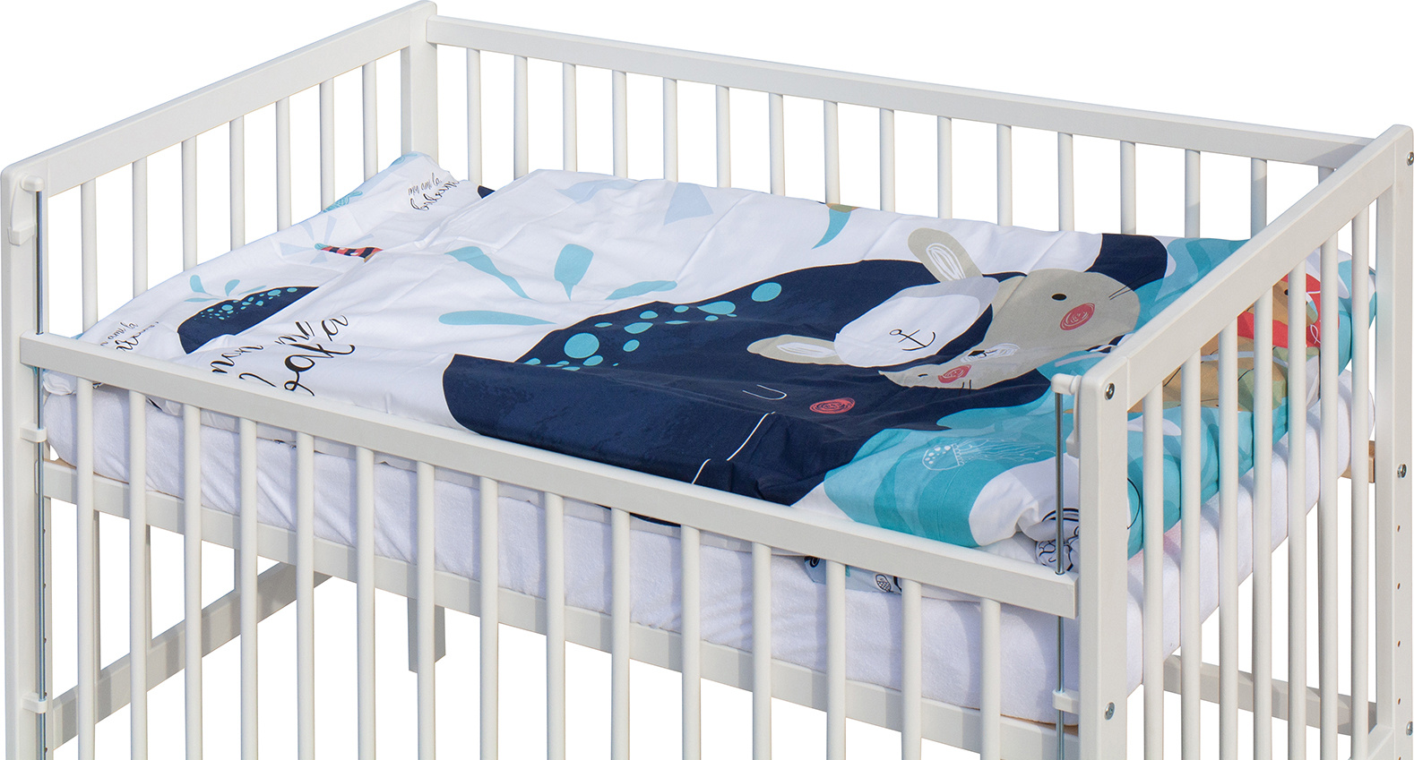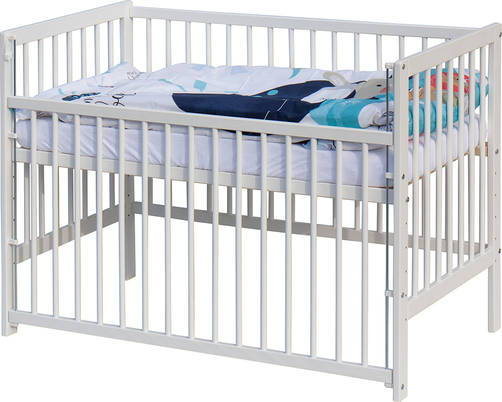1. Dětská dřevěná postýlka 120 x 60 cm - bílá, masiv borovice, stahovací bok, 6 poloh roštu