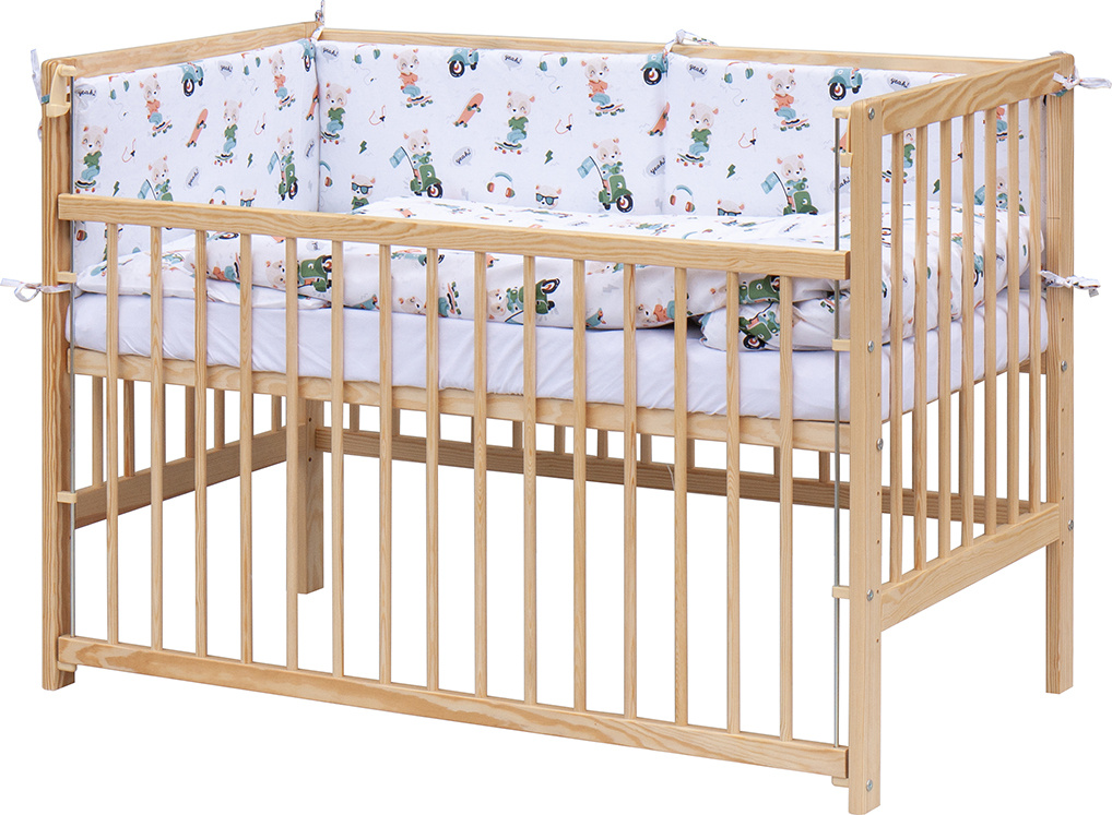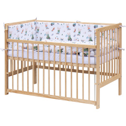 1. Dětská dřevěná postýlka 120 x 60 cm - přírodní, masiv borovice, stahovací bok, 6 poloh roštu