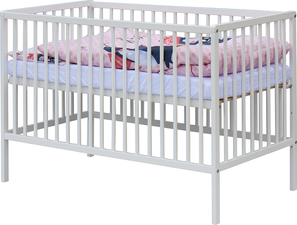 1. Dětská dřevěná postýlka 120x60 cm - bílá, masiv buk, 3 vyndavací příčky, 3 polohy roštu