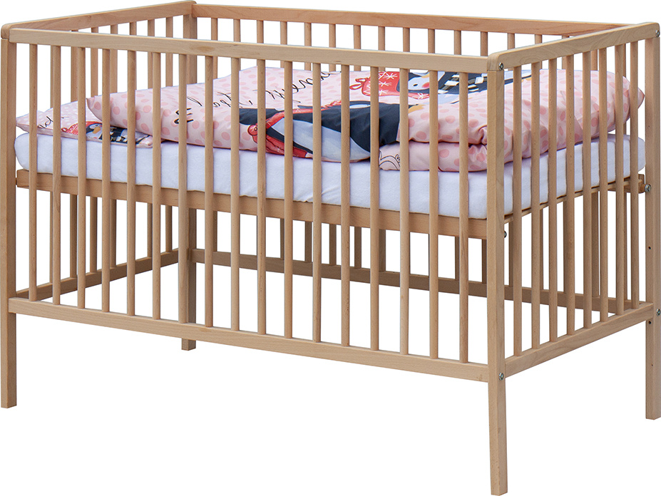 1. Dětská dřevěná postýlka 120 x 60 cm - přírodní, masiv borovice, 3 vyndavací příčky, 3 polohy roštu,