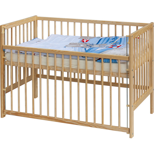 1. Dětská dřevěná postýlka 120 x 60 cm - přírodní, masiv borovice, stahovací bok, 6 poloh roštu