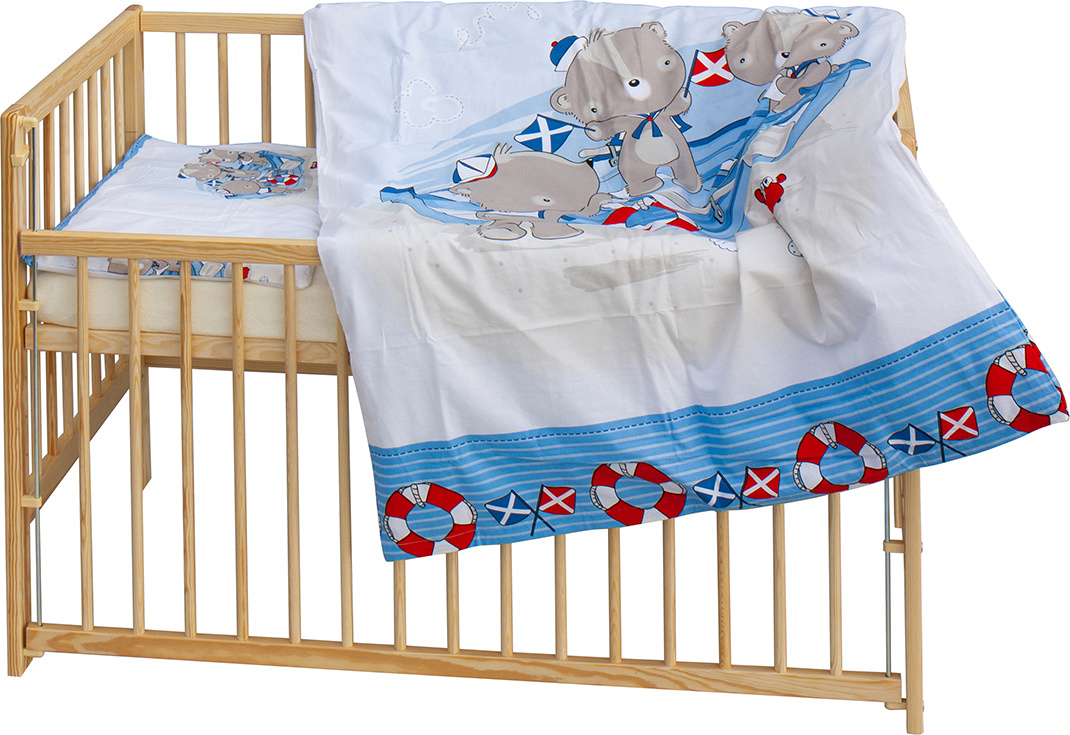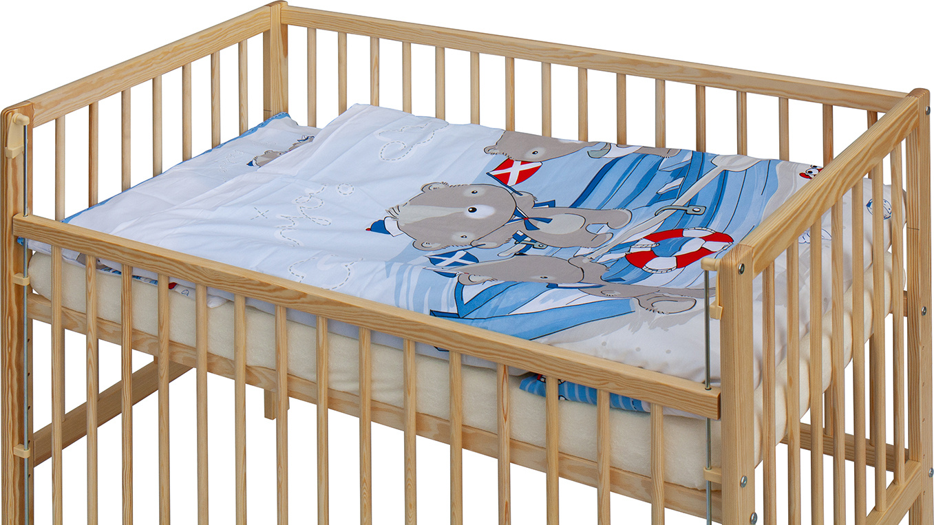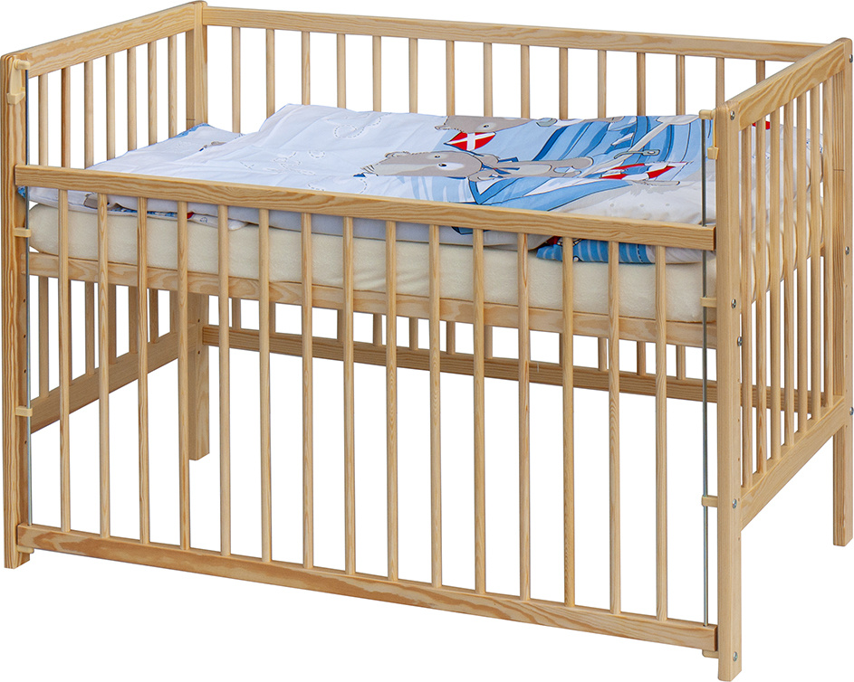 1. Dětská dřevěná postýlka 120 x 60 cm - přírodní, masiv borovice, stahovací bok, 6 poloh roštu