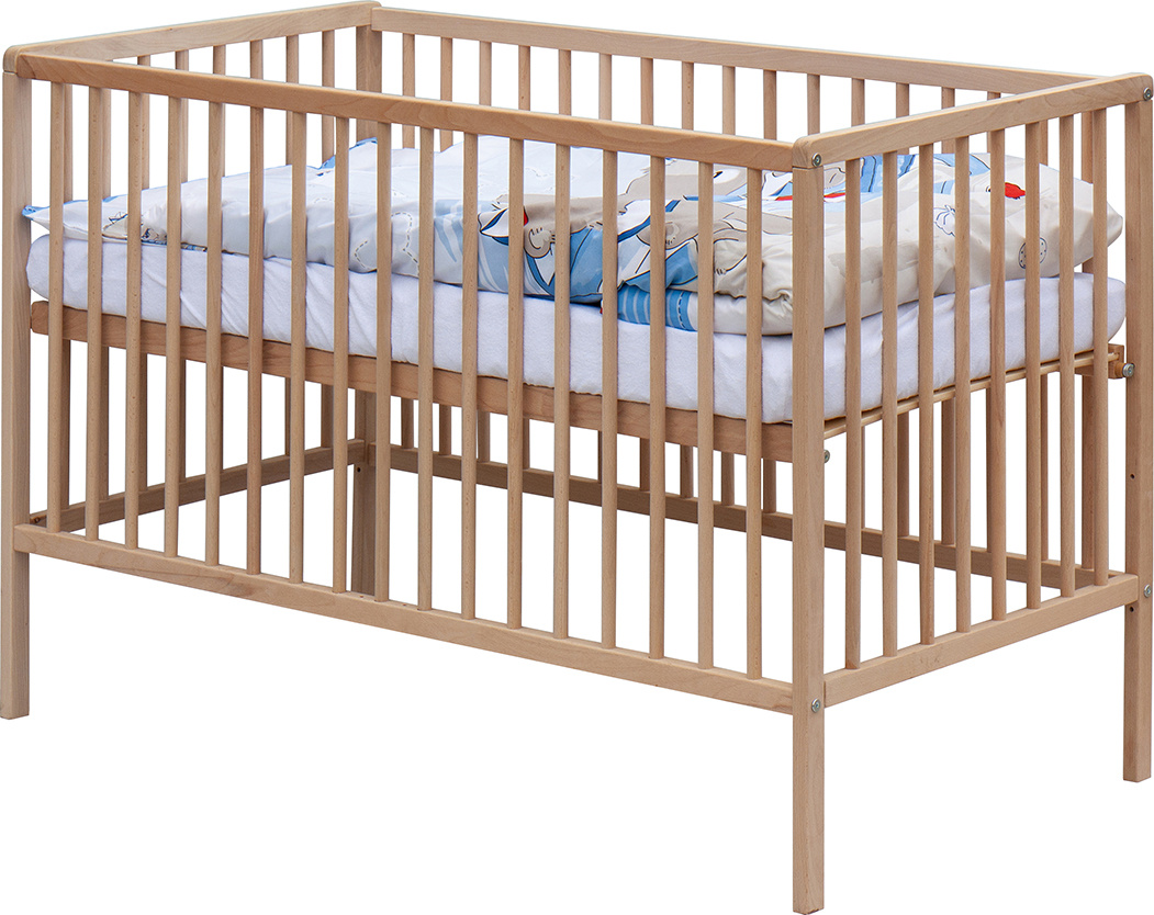 1. Dětská dřevěná postýlka 120 x 60 cm - přírodní, masiv borovice, 3 vyndavací příčky, 3 polohy roštu,