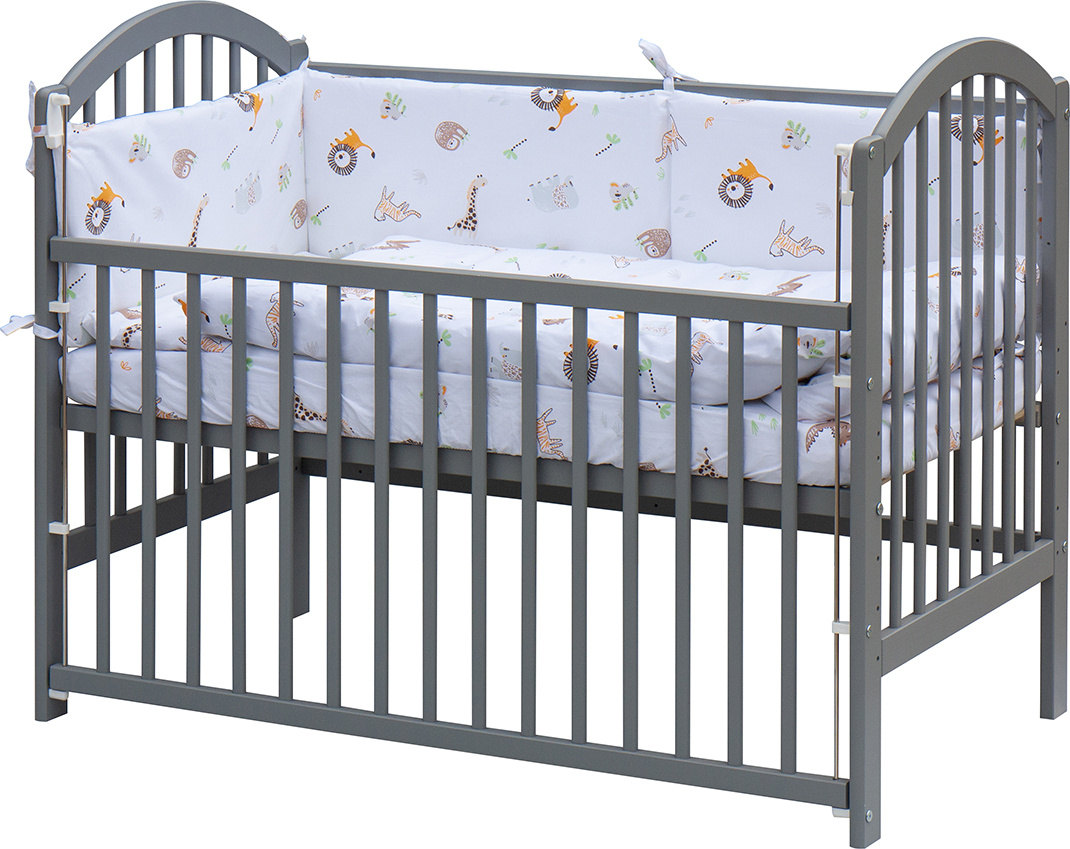 1. Dětská dřevěná postýlka 120 x 60 cm - šedá, masiv borovice, stahovací bok, 6 poloh roštu, nohy postýlky jsou předvrtané pro případné nasazení koleček