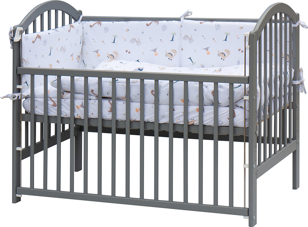 1. Dětská dřevěná postýlka 120 x 60 cm - šedá, masiv borovice, stahovací bok, 6 poloh roštu, nohy postýlky jsou předvrtané pro případné nasazení koleček
