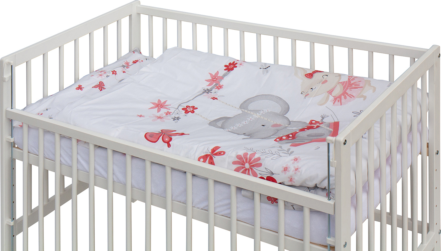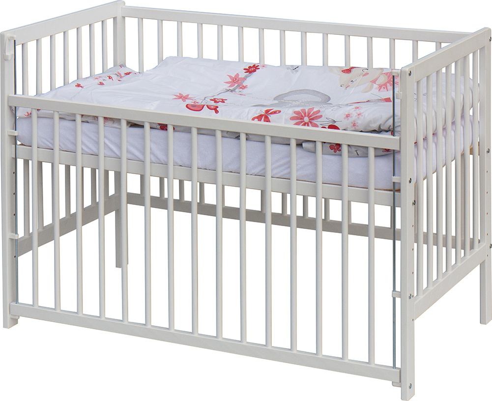 1. Dětská dřevěná postýlka 120 x 60 cm - bílá, masiv borovice, stahovací bok, 6 poloh roštu