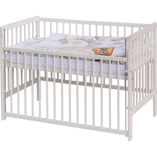 1. Dětská dřevěná postýlka 120 x 60 cm - bílá, masiv borovice, stahovací bok, 6 poloh roštu