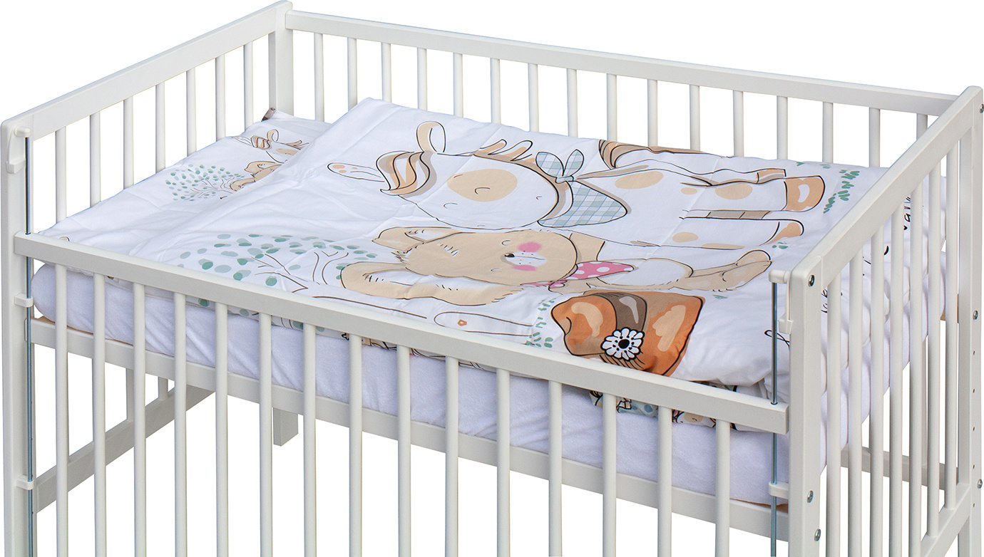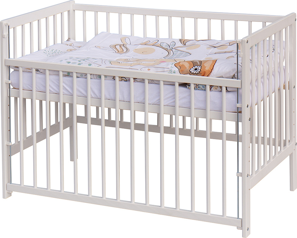 1. Dětská dřevěná postýlka 120 x 60 cm - bílá, masiv borovice, stahovací bok, 6 poloh roštu