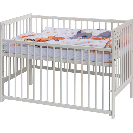 1. Dětská dřevěná postýlka 120 x 60 cm - bílá, masiv borovice, stahovací bok, 6 poloh roštu