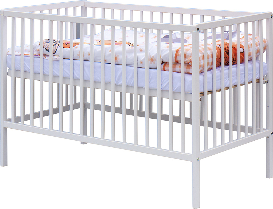1. Dětská dřevěná postýlka 120x60 cm - bílá, masiv buk, 3 vyndavací příčky, 3 polohy roštu