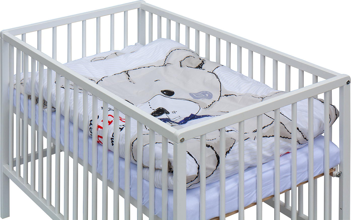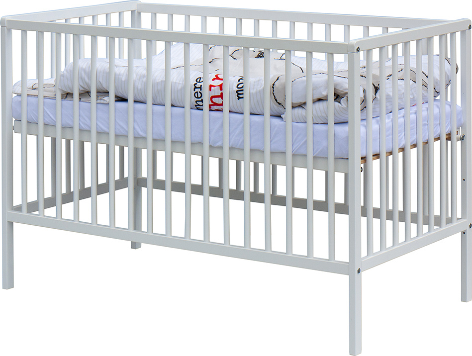1. Dětská dřevěná postýlka 120x60 cm - bílá, masiv buk, 3 vyndavací příčky, 3 polohy roštu
