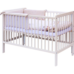 1. Dětská dřevěná postýlka 120 x 60 cm - bílá, masiv borovice, 3 vyndavací příčky, 5 polohy roštu, nohy postýlky jsou předvrtány pro případné nasazení koleček