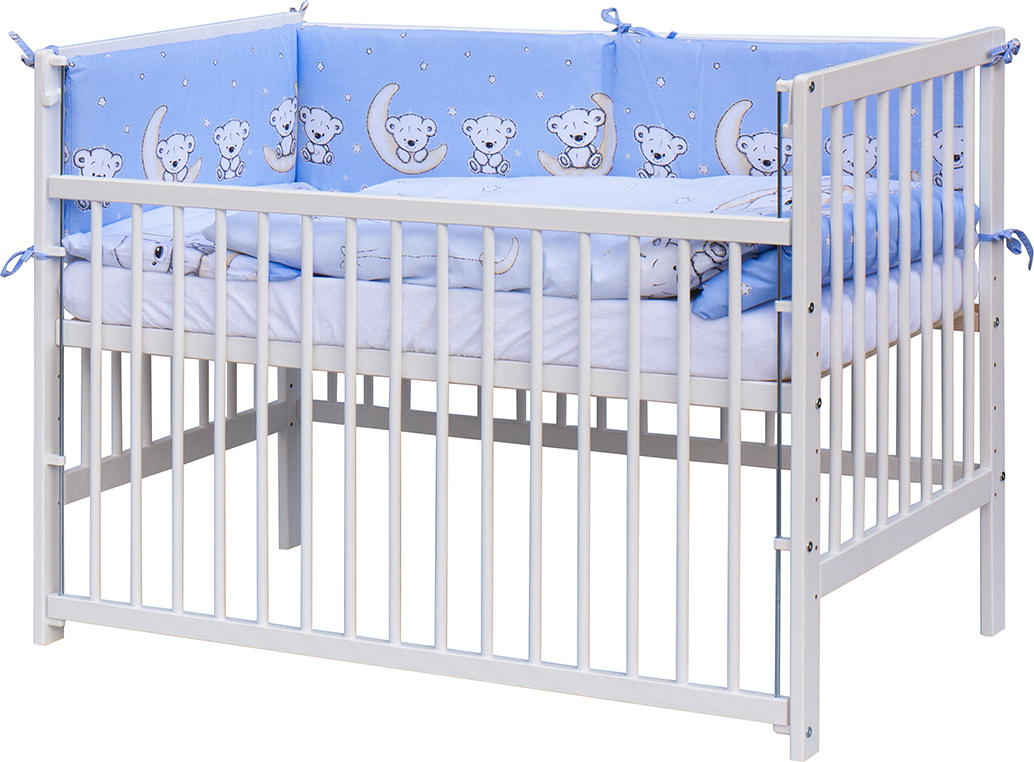 1. Dětská dřevěná postýlka 120 x 60 cm - bílá, masiv buk, stahovací bok, 6 poloh roštu