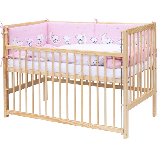 1. Dětská dřevěná postýlka 120 x 60 cm - přírodní, masiv borovice, stahovací bok, 6 poloh roštu