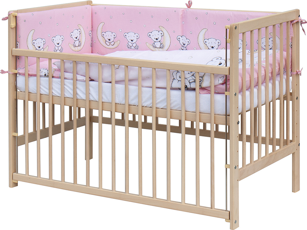 1. Dětská dřevěná postýlka 120 x 60 cm - přírodní, masiv buk, stahovací bok, 6 poloh roštu