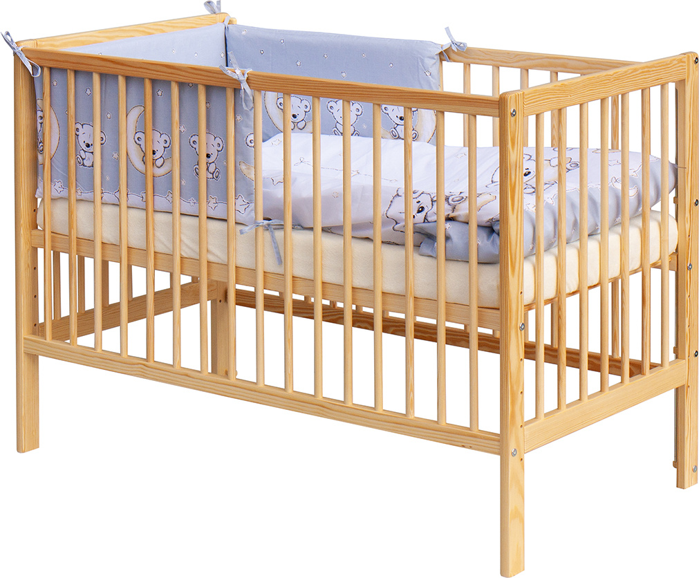 1. Dětská dřevěná postýlka 120 x 60 cm - přírodní, masiv borovice, 3 vyndavací příčky, 6 polohy roštu, nohy postýlky jsou předvrtány pro případné nasazení koleček