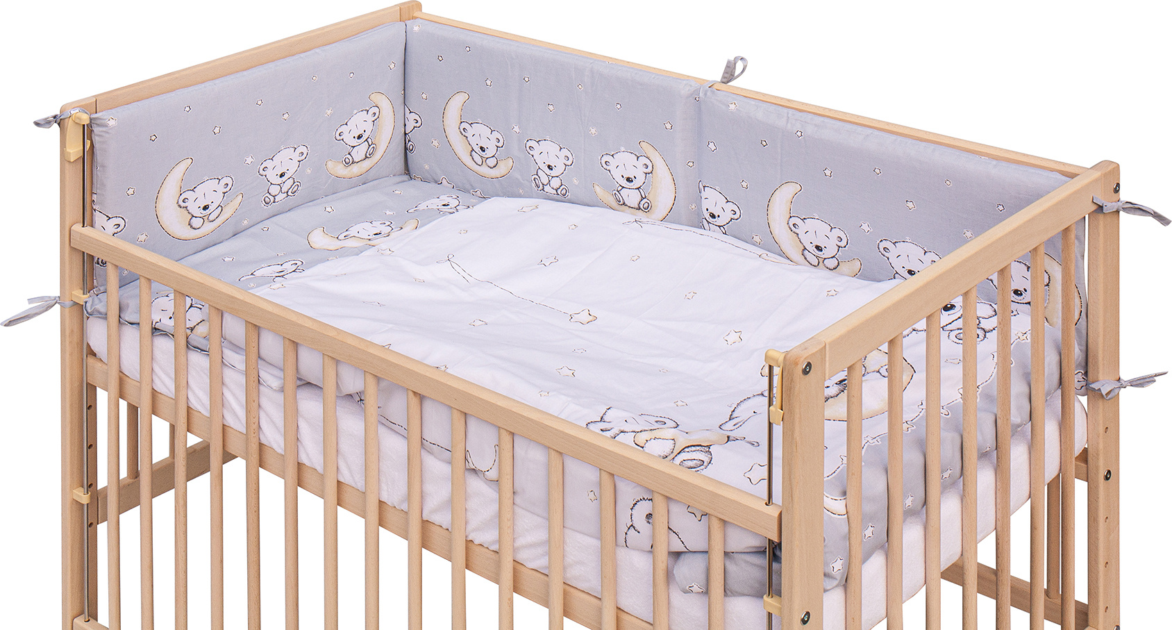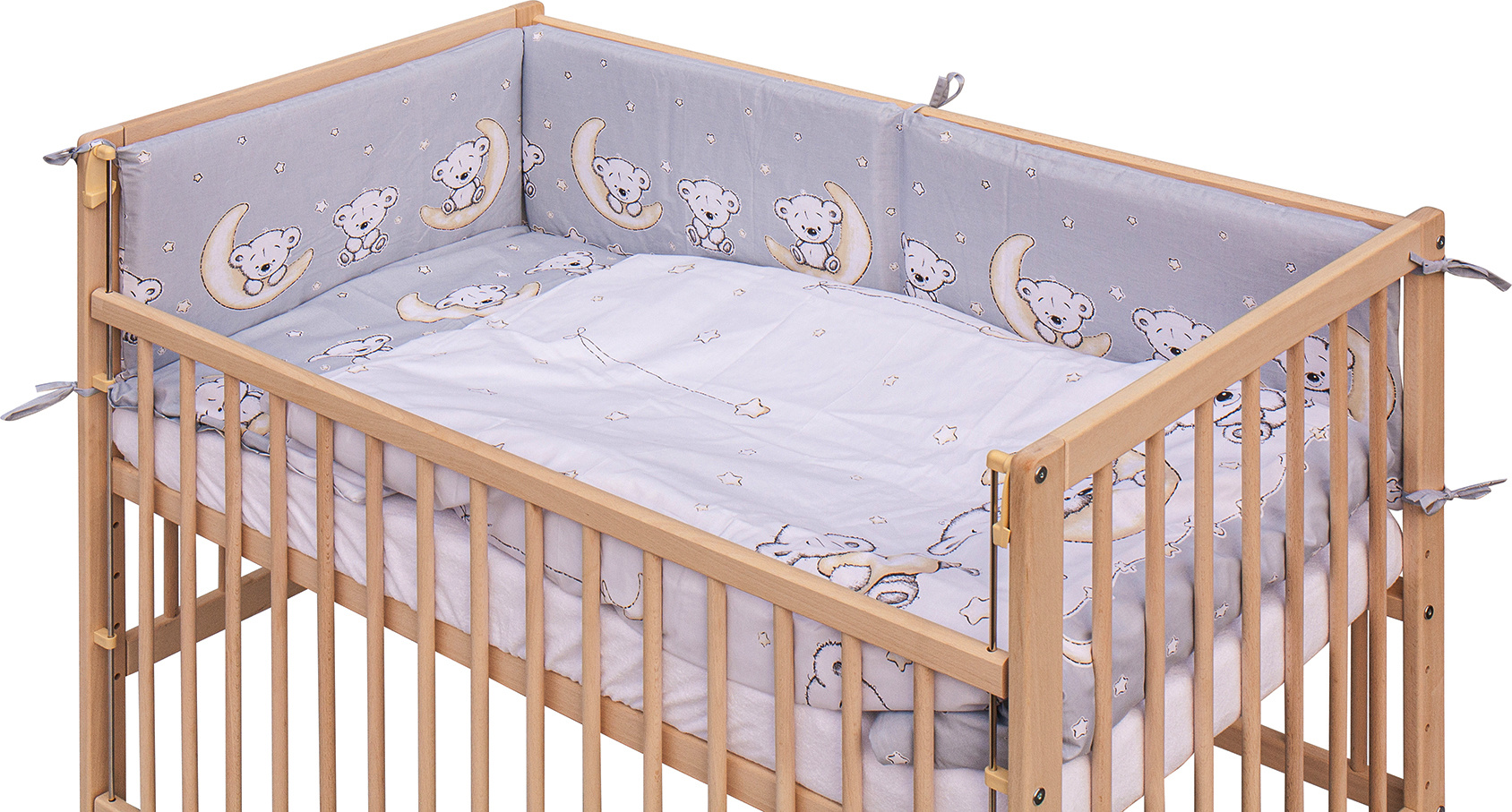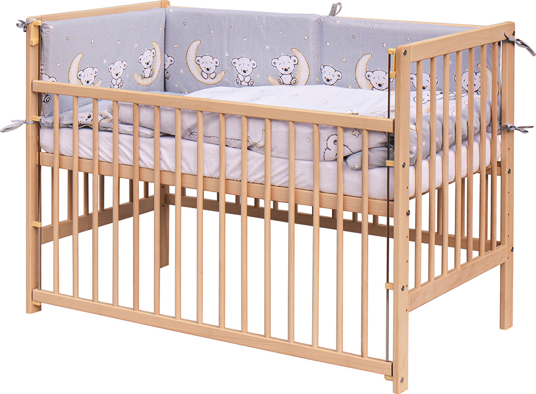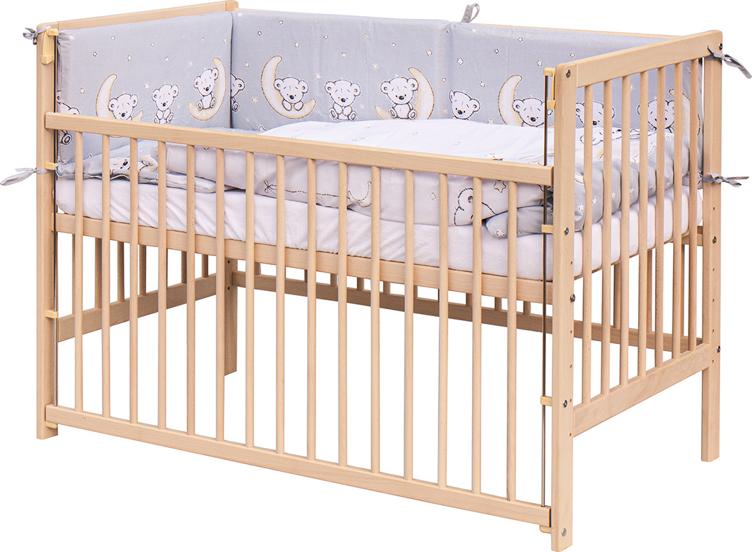 1. Dětská dřevěná postýlka 120 x 60 cm - přírodní, masiv buk, stahovací bok, 6 poloh roštu
