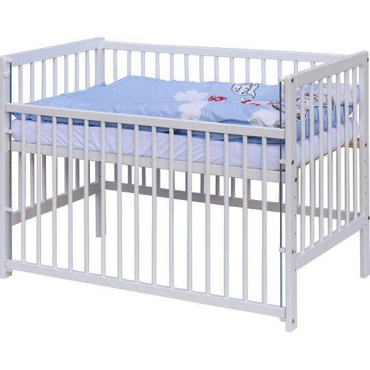 1. Dětská dřevěná postýlka 120 x 60 cm - bílá, masiv buk, stahovací bok, 6 poloh roštu