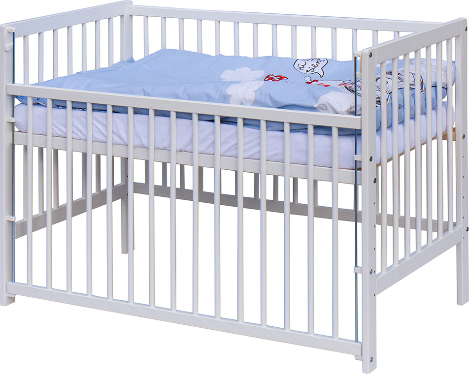 1. Dětská dřevěná postýlka 120 x 60 cm - bílá, masiv buk, stahovací bok, 6 poloh roštu