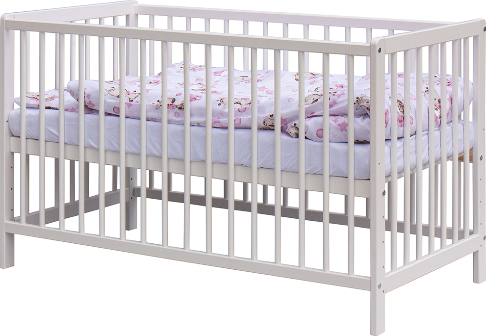 1. Dětská dřevěná postýlka 120x60 cm - bílá, masiv borovice, 3 vyndavací příčky, 5 poloh roštu