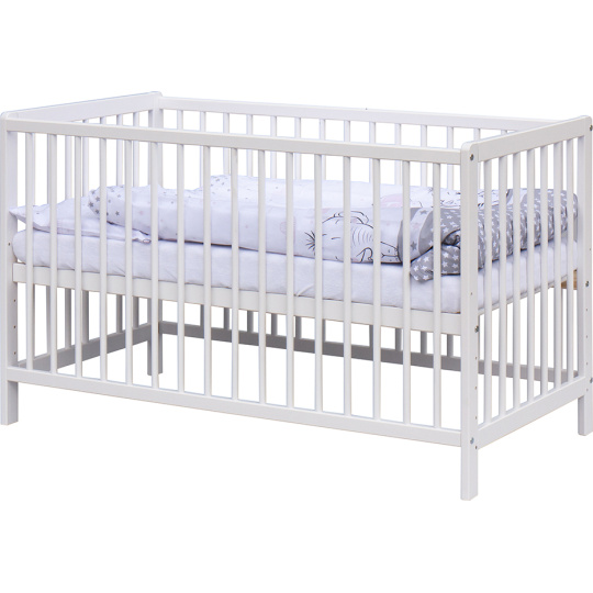 1. Dětská dřevěná postýlka 120x60 cm - bílá, masiv borovice, 3 vyndavací příčky, 5 poloh roštu