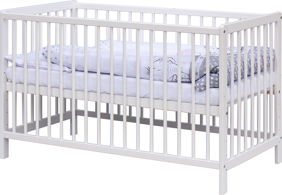 1. Dětská dřevěná postýlka 120x60 cm - bílá, masiv borovice, 3 vyndavací příčky, 5 poloh roštu