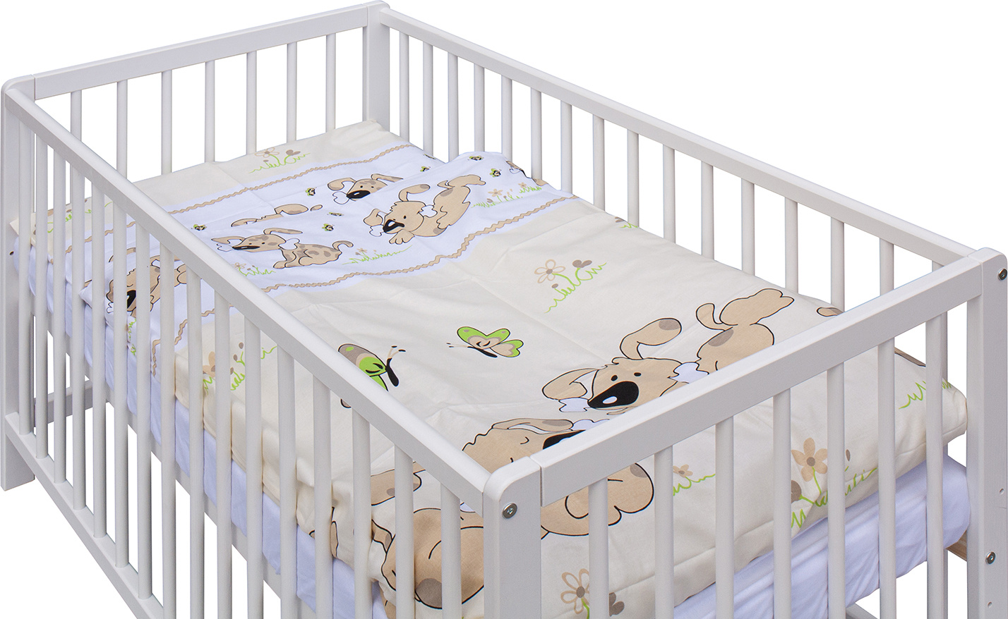 1. Dětská dřevěná postýlka 120x60 cm - bílá, masiv borovice, 3 vyndavací příčky, 5 poloh roštu