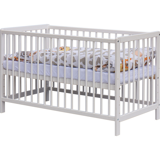 1. Dětská dřevěná postýlka 120x60 cm - bílá, masiv borovice, 3 vyndavací příčky, 5 poloh roštu