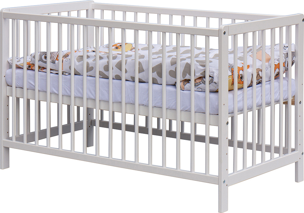 1. Dětská dřevěná postýlka 120x60 cm - bílá, masiv borovice, 3 vyndavací příčky, 5 poloh roštu