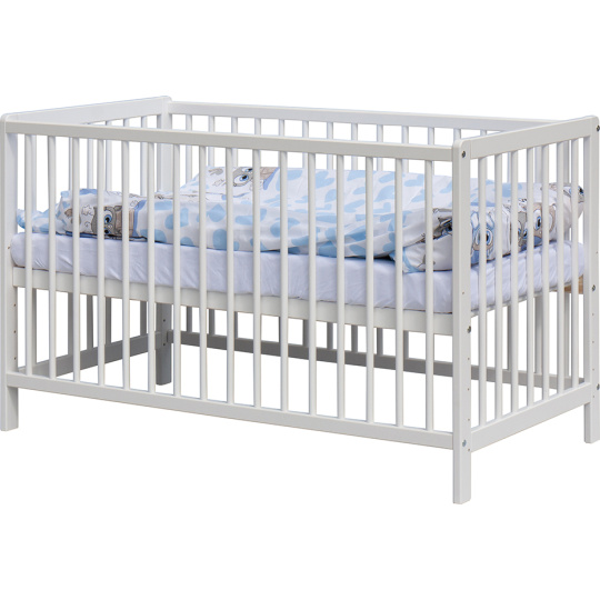1. Dětská dřevěná postýlka 120x60 cm - bílá, masiv borovice, 3 vyndavací příčky, 5 poloh roštu