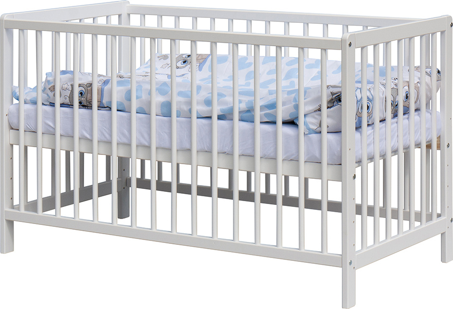 1. Dětská dřevěná postýlka 120x60 cm - bílá, masiv borovice, 3 vyndavací příčky, 5 poloh roštu