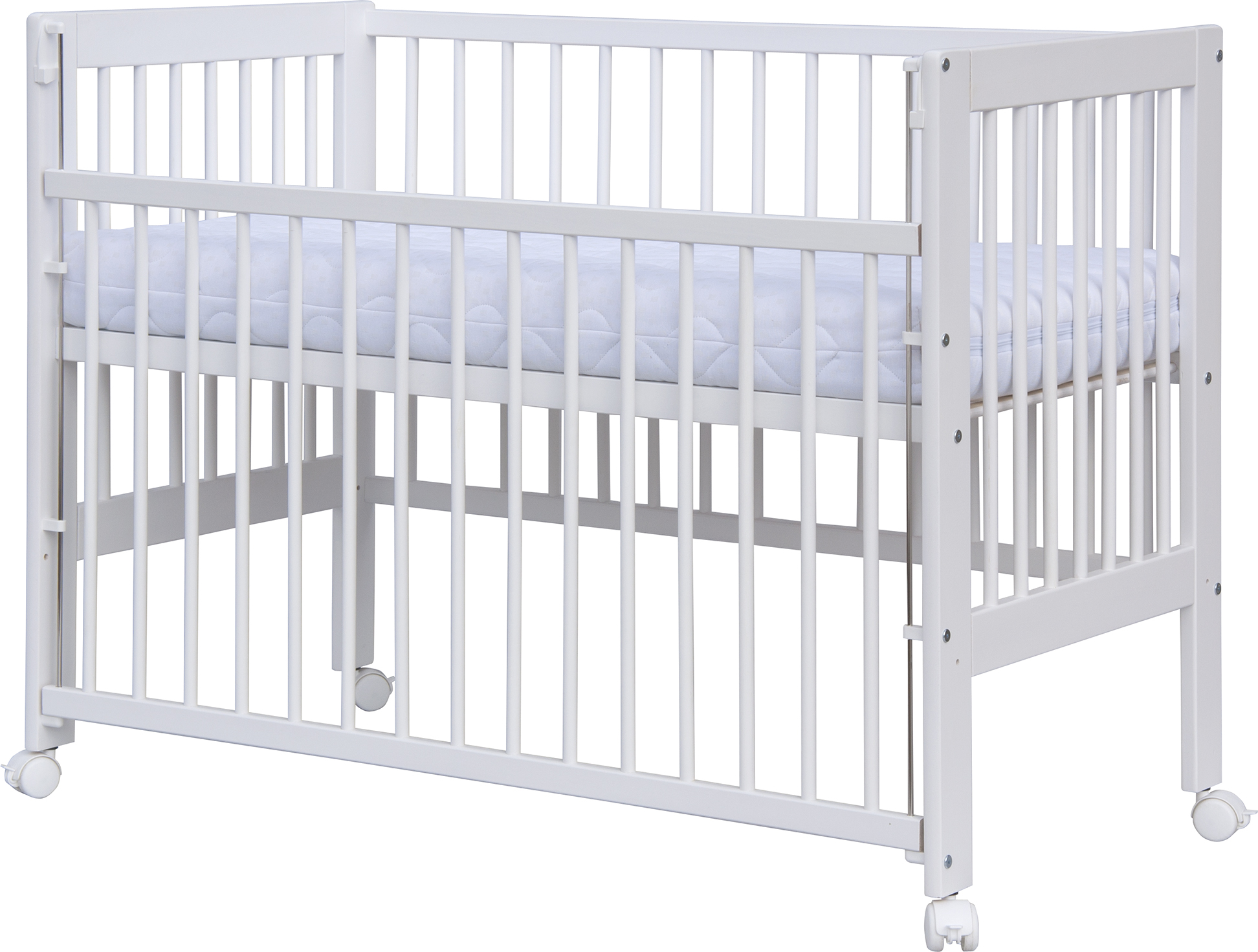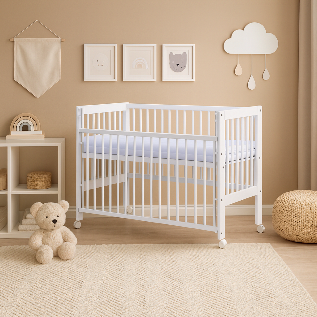 K postýlce lze samostatně dokoupit kolečka a matraci podle individuálních potřeb – vše naleznete v naší nabídce doplňků.