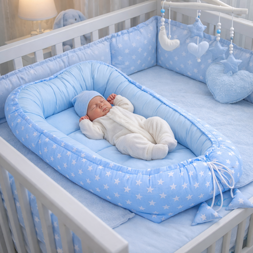 Hnízdečko je možné vložit do postýlky, koše nebo kolébky. Tímto zabezpečí miminku jeho ohraničený prostor. Vysoké okraje umožňují polohování miminka i na bok.