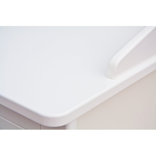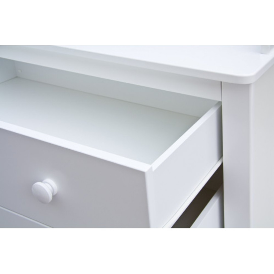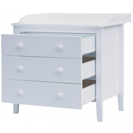 Bílá přebalovací komoda je vyrobena z bukového dřeva, laminátu a MDF. Přebalovací pult je možné oddělit. Komoda obsahuje 3 prostorné šuplíky. Komoda je velmi robustní, proto není třeba dalšího jištění proti převrácení.