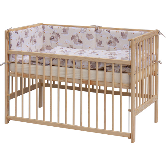 1. Dětská dřevěná postýlka 120 x 60 cm, masiv borovice, stahovací bok, 6 poloh roštu